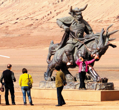 下車之后的第一站便是“西游文化長廊”,長廊之中安置了二十四幅《西游記》中經(jīng)典故事的壁畫。在“三借芭蕉扇”的畫前駐足,畫中的猴哥栩栩如生,看著墻上的故事,想想剛才見到的奇景,此行便越發(fā)興味盎然。走出展廳,進(jìn)入廣場,眼前一根高大筆直的金箍棒吸引了我的視線,難不成是猴哥當(dāng)年用金箍棒換了鐵扇公主的芭蕉扇不成?實(shí)際上,這是一根溫度計(jì),上面顯示著實(shí)時溫度,讓人直觀地感受著這里的酷熱。
