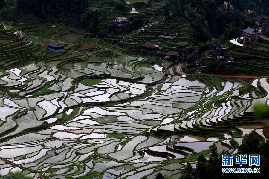 5月20日在廣西柳州市融水苗族自治縣桿洞鄉(xiāng)拍攝的梯田。廣西柳州市融水苗族自治縣桿洞鄉(xiāng)平均海拔780多米,是全縣高海拔鄉(xiāng)鎮(zhèn)之一。這里的梯田多在高山,人們稱之為“天上糧倉(cāng)”。時(shí)下,“天上糧倉(cāng)”或儲(chǔ)水待插,或新秧初栽,如織錦一般美不勝收。新華社發(fā)(龍濤 攝)