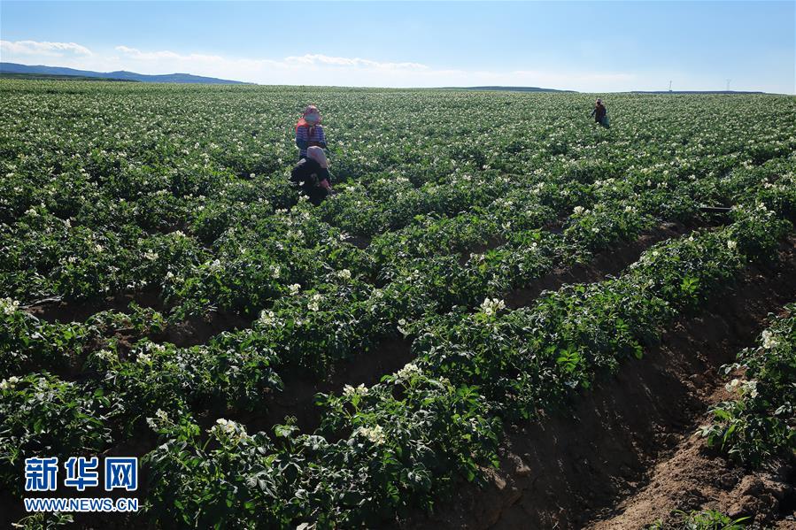 7月19日,在甘肅省定西市安定區(qū)香泉鎮(zhèn)馬鈴薯種植基地,農(nóng)民在進(jìn)行馬鈴薯田間管理。
