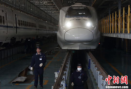 1月15日,南京動車運用所的工作人員對滬寧城際動車組列車進行精檢細(xì)修,通過全面的“體檢”確保其安全運行。據(jù)悉,春運期間,上海鐵路局開行客車總數(shù)達1053對,其中安排動車組達到663對,占比63%,運力為歷年之最。