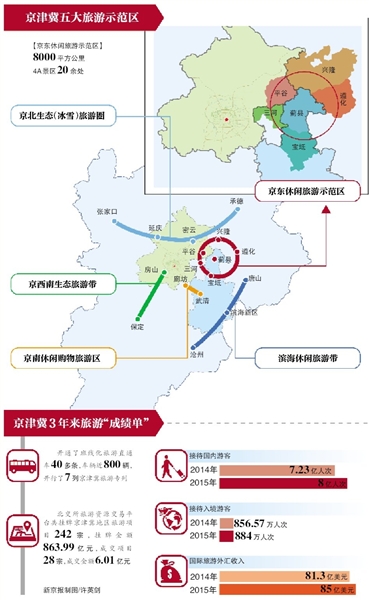 三地共同打造京東休閑旅游示范區(qū)、京北生態(tài)(冰雪)旅游圈、京西南生態(tài)旅游帶、京南休閑購(gòu)物旅游區(qū)、濱海休閑旅游帶等5個(gè)旅游試點(diǎn)示范,成為三地共建旅游大格局的新標(biāo)桿。家人出城休閑度假,可以選擇京東休閑旅游示范區(qū);如果三五好友想體驗(yàn)冰雪娛樂,則可到京北生態(tài)(冰雪)旅游圈;橫跨京冀兩地的房山世界地質(zhì)公園,則是京西南生態(tài)旅游帶內(nèi)的特色景點(diǎn);而天津武清、河北廊坊則打造成為京南休閑購(gòu)物旅游區(qū)。