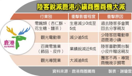 大陸游客減少后,臺灣旅游業(yè)“冷颼颼”。據(jù)臺灣《中國時報》報道,過去大陸游客團(tuán)赴臺,若住宿中部準(zhǔn)備出發(fā)前往日月潭途中,必定會先到訪鹿港小鎮(zhèn)。民意代表王惠美觀察,大陸游客不來之后,光是中山路上的店家生意就掉了一半。觀光電動車、賣小吃和皮件的攤商感受最深,曾經(jīng)忙到應(yīng)接不暇的導(dǎo)覽解說員,現(xiàn)在只能主動出擊,通過民間協(xié)會發(fā)函邀請大陸游客組團(tuán)赴臺交流參訪。