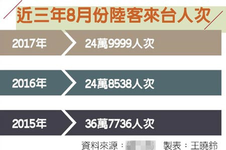 近三年8月份大陸游客赴臺人次。(圖片來源:臺灣《旺報》)