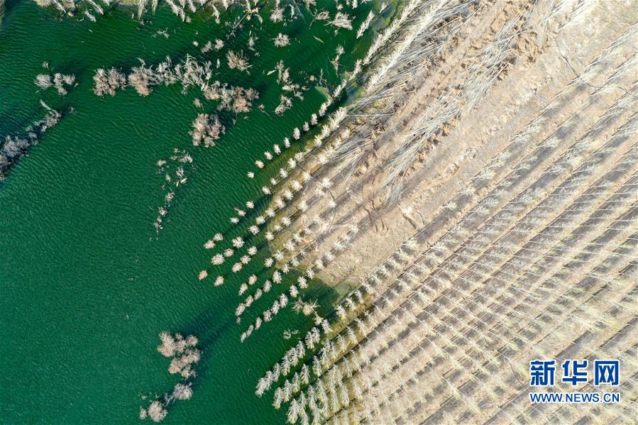 這是4月19日拍攝的阿勒泰市中水庫(kù)一角(無(wú)人機(jī)照片)。近年來(lái),新疆阿勒泰市利用經(jīng)污水處理廠(chǎng)處理達(dá)標(biāo)后的中水,灌溉建在戈壁灘上的苗圃基地,形成良性循環(huán),助力綠化工程,改善生態(tài)環(huán)境。從2017年至今,阿勒泰市中水回用環(huán)境治理示范園已為當(dāng)?shù)鼐G化工程提供40萬(wàn)株樹(shù)苗,實(shí)現(xiàn)5000畝荒山綠化。 新華社記者 丁磊 攝