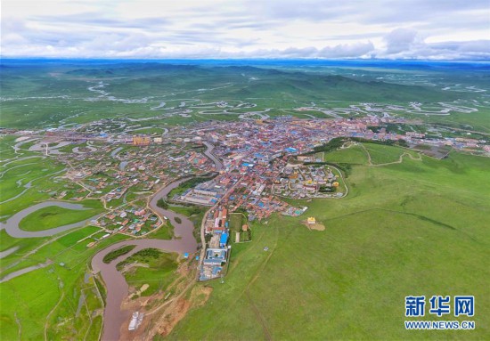 四川省阿壩藏族羌族自治州若爾蓋縣縣城、熱曲河(近)和黑河(遠(yuǎn))(6月17日攝,無人機(jī)照片)。 新華社記者 劉坤 攝