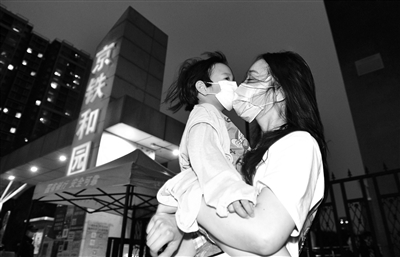 昨晚8點(diǎn)剛過(guò),京鐵和園小區(qū)已有居民走出小區(qū),前往附近的超市、公園。在小區(qū)門(mén)口,3歲的多多老遠(yuǎn)就看到門(mén)外的媽媽,高興壞了。多多的媽媽告訴北青報(bào)記者,孩子一直住在京鐵和園的奶奶家,社區(qū)封閉后,她只能晚上隔著大門(mén)看看孩子。聽(tīng)說(shuō)昨晚社區(qū)解除封閉,她特意趕過(guò)來(lái)想抱一抱多多。不過(guò),由于多多和奶奶的出入證正在辦理中,孩子還不能走出小區(qū)。在征得門(mén)口值守人員的同意后,多多跟媽媽終于在小區(qū)外重逢,母子倆擁抱在一起。