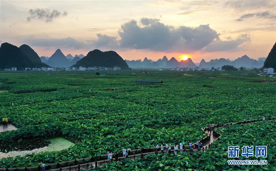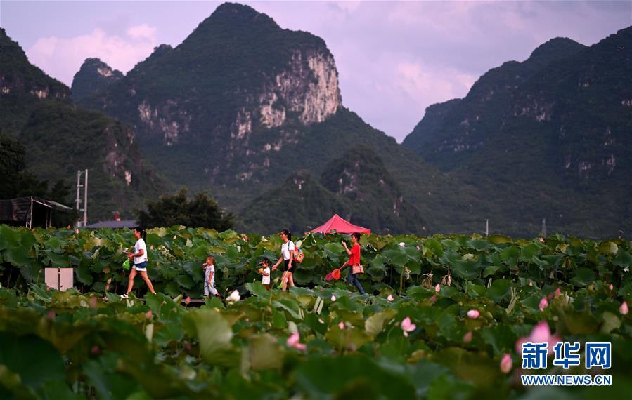 6月28日,游客在廣西柳州市柳江區(qū)百朋鎮(zhèn)萬(wàn)畝荷塘里游玩。新華社發(fā)(黎寒池 攝)