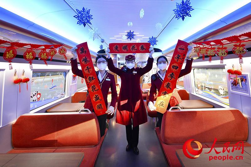2021年春運是疫情防控常態(tài)化下的首個春運,全國上下提倡就地過年,鐵路部門科學(xué)調(diào)整運力,努力實現(xiàn)“平安春運、有序春運、溫馨春運,讓旅客體驗更美好”的春運目標。2021年2月4日,正值北方小年,同時也是北京2022年冬殘奧會開幕倒計時一周年,北京局集團公司北京客運段京張高鐵車隊擔(dān)當(dāng)?shù)腉8881次列車始發(fā)前,列車工作人員用窗花等裝飾品布置車廂,打造溫馨的出行環(huán)境,營造濃濃的“年味”。(圖片來源:北京鐵路局集團公司北京客運段 毛衛(wèi)華 攝)
