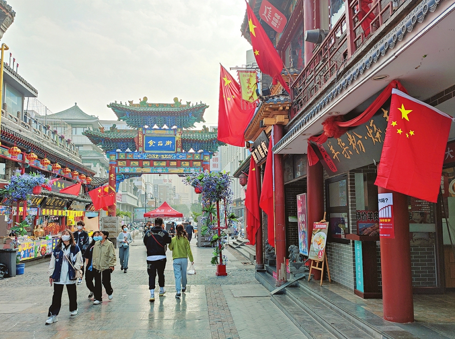10月7日,省城食品街,在查驗(yàn)雙碼、測(cè)量體溫后,游客愉快購(gòu)物、體驗(yàn)美食,享受假期的輕松和歡樂(lè)。