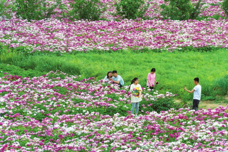 5月2日,游客正在平陸縣太陽渡村盛開的芍藥花田中賞花游玩。姜樺攝