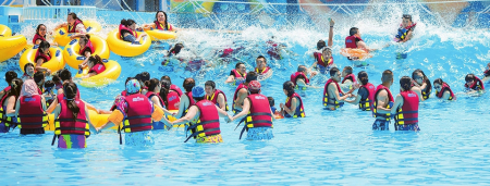 走進精衛(wèi)水世界,陽光、椰林、沙灘,以及南方綠色植物景觀和卡通造型,讓人仿佛置身空氣清新、陽光明媚的海邊城市。這里可以體驗以海浪海嘯為主題的探險,在大喇叭、彩虹滑梯、大型水寨等水上娛樂項目間穿梭嬉戲,感受水世界的無限清涼。在冒險廣場,最刺激的和好玩的都在這里——大擺錘、魔法過山車、旋轉(zhuǎn)杯、海盜船、高空飛行、旋轉(zhuǎn)木馬、碰碰車、蹦極、火箭蹦極、尖叫、飛鷹、探空飛梭……光是聽到游客的尖叫聲,就令人興奮起來。特別是勇者無懼的蹦極,看似放棄一切的縱身一躍,竟也是將自己心靈放空所尋求的“涅槃”。