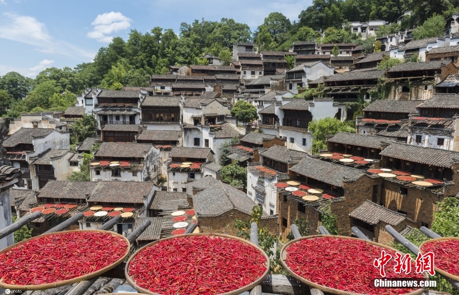 由于婺源的大多村莊是依山而建,平地較少,為將晾曬的食材安排的合理妥當(dāng),家家戶戶都展現(xiàn)了自家“空間管理”的高超技巧。圖為江西上饒婺源篁嶺古村,篁嶺獨(dú)具古韻的閣樓人家,處處可見(jiàn)絢爛的曬秋。稻谷、玉米、南瓜、豌豆、蘿卜曬在竹匾上,用橫木托著。
