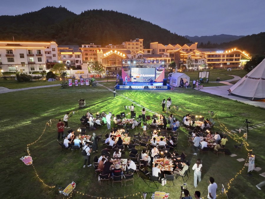 新華社南昌10月6日電(記者朱雨諾、程迪)夜幕之下,江西萍鄉(xiāng)市武功山景區(qū)的驢友帳篷大本營內(nèi)熱鬧非凡。喜愛音樂的游客在演出現(xiàn)場跟著歌曲旋律搖擺,也有不少游客三五成群,坐在天幕下邊看電影邊吃燒烤,享受著假期悠閑時光。