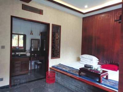 這里的房間比一般客棧寬敞許多,而且每間房都風(fēng)格迥異,比如有的床頭是充滿意境的書畫,有的床頭是雕刻花紋的木板,有的多了古典桌椅,有的放置了茶幾,有的則多了沙發(fā)、屏風(fēng)或條幾、膽瓶……每間房都融合了寧靜與古樸的元素,屋子里擺放的瓷壇和衣柜等老物件寫滿歲月的痕跡。