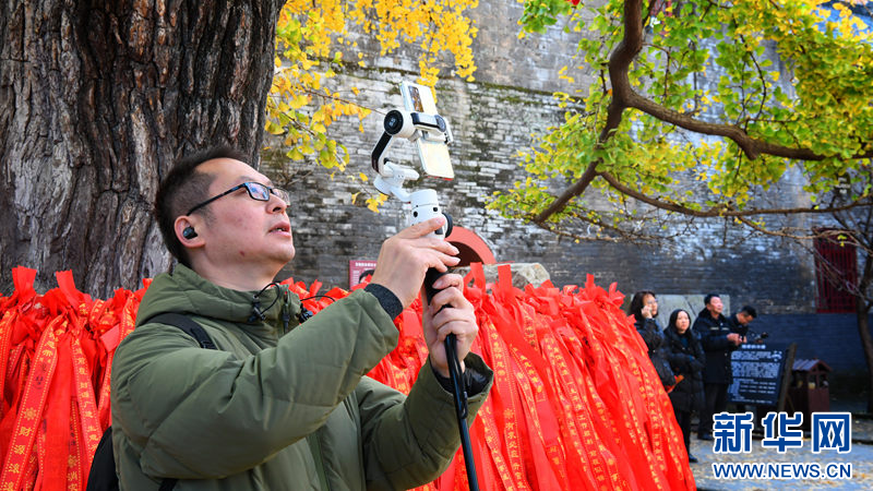 近日,佇立在湖北襄陽廣德寺內(nèi)的銀杏古樹迎來最佳觀賞期,吸引了眾多游客前來拍照打卡。 楊瀟攝 新華網(wǎng)發(fā)