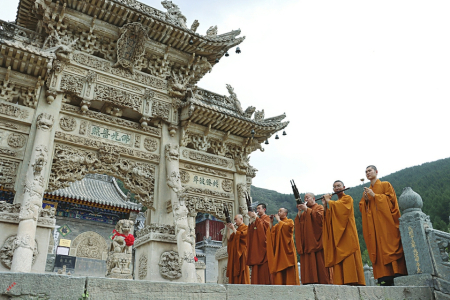 一次五臺(tái)山,五百年因緣。剛到龍泉寺108級(jí)臺(tái)階下,就聽(tīng)到婉轉(zhuǎn)悠揚(yáng)又直入人心的樂(lè)曲聲從高處傳來(lái)。走到龍泉寺三寶之一的照壁抬眼向高望去,越過(guò)青石臺(tái)階,第二寶石牌坊下,一隊(duì)僧人正在演繹國(guó)家級(jí)非物質(zhì)文化遺產(chǎn)五臺(tái)山佛樂(lè)。