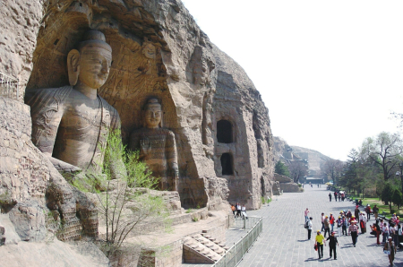 大同云岡石窟依山開(kāi)鑿,是中外文化、中國(guó)少數(shù)民族文化和中原文化、佛教藝術(shù)與石刻藝術(shù)相融合的一座文化藝術(shù)寶庫(kù)。