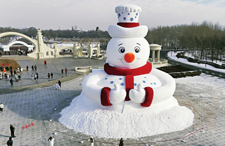 12月8日,哈爾濱今冬第一個大雪人“雪人先生”在太陽島風(fēng)景區(qū)落成。大雪人高20米,用雪量4000立方米。圖為12月9日在哈爾濱太陽島風(fēng)景區(qū)正門廣場拍攝的大雪人(無人機(jī)照片)。