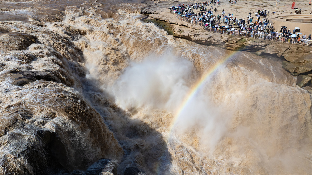 奔騰的黃河壺口瀑布吸引眾多游客前來觀賞。