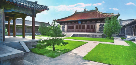 永安寺,原稱渾源州永安禪寺及神州大永安禪寺,俗稱“大寺”,始建于金,金元之交被火毀后重建,明、清以來均曾在當?shù)毓賳T倡導(dǎo)下續(xù)建與增修。該寺位于渾源古城東北隅,坐西北朝東南,本為以中軸線為主,東西軸各輔以跨院或偏院的五進場院空間大型寺廟建筑群,現(xiàn)僅存前院及東西跨院和中院主體建筑群,東西寬52米,南北深78米,占地面積4056平方米。寺內(nèi)現(xiàn)存文物建筑物7座、清代壁畫305.4平方米、建筑彩畫2118平方米,古代碑碣2方,石獅一對。主殿傳法正宗殿為元延祐二年(1315年)原構(gòu),是我國建筑史上廡殿頂建筑的杰作,殿內(nèi)滿堂水陸畫、建筑彩畫及殿頂五彩琉璃均保存完好且異常精美,聞名遐邇。