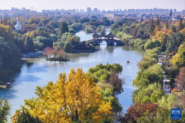 11月18日,游客在江蘇揚(yáng)州瘦西湖風(fēng)景區(qū)游覽(無(wú)人機(jī)照片)。新華社發(fā)(孟德龍攝)