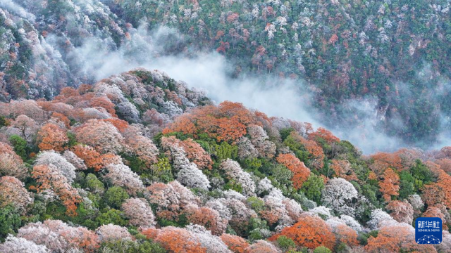 11月18日在貴州梵凈山景區(qū)拍攝的霧凇紅葉景觀(無(wú)人機(jī)照片)。新華社發(fā)(李鶴攝)