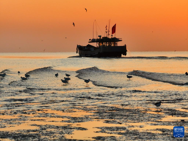 11月19日,海鳥(niǎo)在江蘇省連云港市贛榆區(qū)沿海濕地里覓食(無(wú)人機(jī)照片)。新華社發(fā)(司偉攝)