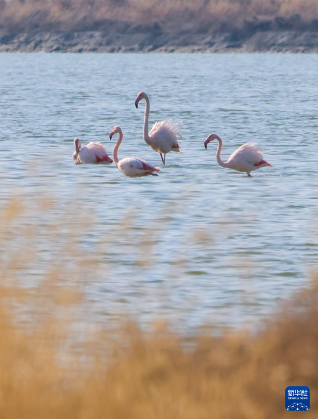 11月19日,火烈鳥(niǎo)在山西運(yùn)城鹽湖棲息。新華社發(fā)(閆鑫攝)