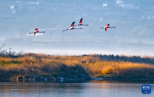 11月19日,火烈鳥(niǎo)在山西省運(yùn)城鹽湖濕地飛翔。新華社發(fā)(薛俊攝)