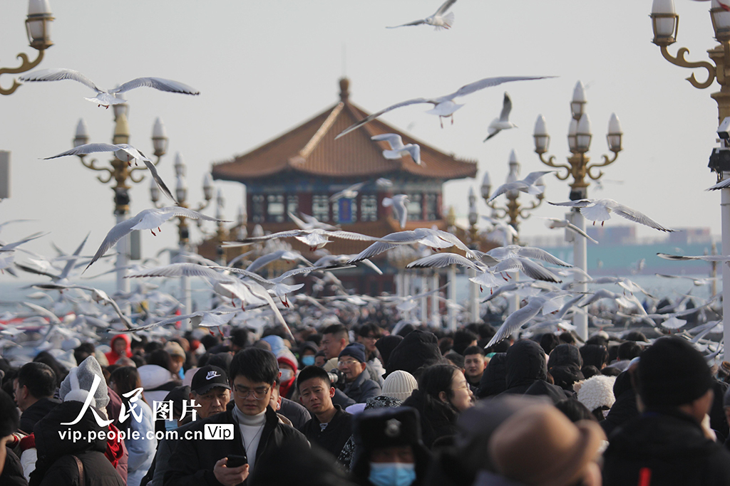 2026年1月30日,山東青島棧橋景區(qū),成群的海鷗在空中飛翔盤旋,吸引眾多游客前來(lái)觀賞互動(dòng),拍照留影。黃杰顯攝(人民圖片網(wǎng))