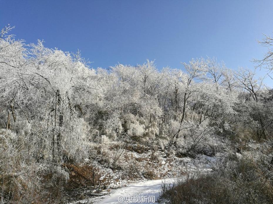 受較強(qiáng)冷空氣影響,秦嶺腹地涼風(fēng)埡山頂,出現(xiàn)大面積霧凇景觀。玉樹瓊枝,晶瑩剔透,讓涼風(fēng)埡山頂變得像童話世界一般,美不勝收。 央視記者王志杰 圖片來源:央視新聞微博
