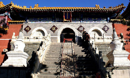 菩薩頂 臺(tái)懷鎮(zhèn)鎮(zhèn)北有一小峰,人稱靈鷲峰,亦名菩薩頂。所以稱之為靈鷲峰,是因?yàn)樗牡乩硇蝿?shì)頗似古印度摩揭陀國(guó)王舍城東北部釋迦牟尼佛說(shuō)法的靈鷲峰故名。據(jù)佛教史籍記載,東漢時(shí)期,我國(guó)佛教最初的傳播人攝摩騰和竺法蘭來(lái)到臺(tái)懷鎮(zhèn),見(jiàn)今菩薩頂?shù)男蝿?shì)頗似印度的靈鷲峰,因而命名之。所以也稱靈鷲峰為菩薩頂,佛教徒傳說(shuō)文殊菩薩曾在峰頂顯靈和說(shuō)法。 (責(zé)任編輯:李冬梅) |