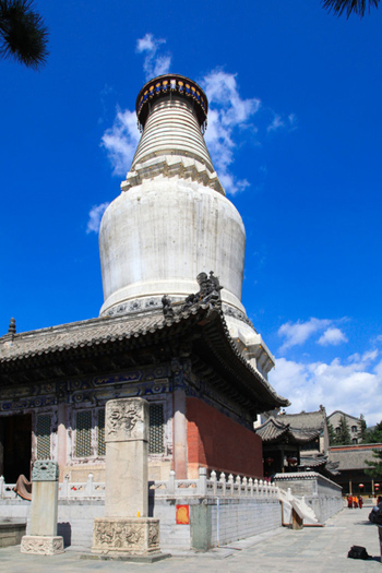塔全稱(chēng)為釋迦牟尼舍利塔,俗稱(chēng)大白塔。塔身?yè)艿囟鹆杩崭呗?,在五臺(tái)山群寺簇?fù)碇骂H為壯觀,人們把它做為五臺(tái)山的標(biāo)志。此塔通高七十五點(diǎn)三米,環(huán)周八十三點(diǎn)三米。塔基為正方形,塔身狀如藻瓶,粗細(xì)相間,方圓搭配,造型優(yōu)美。塔頂蓋銅板八塊成圓形,按乾、坎、艮、震、巽、離、坤、兌等八卦地位安置。塔頂中裝銅頂一枚,高約五米,覆盤(pán)二十一米多,飾有垂檐三十六塊,長(zhǎng)兩米多;每塊垂檐底端掛風(fēng)鐘三個(gè),連同塔腰風(fēng)鐘在內(nèi),全塔共有二百五十二個(gè)。風(fēng)歡鈴動(dòng),叮鐺作響。