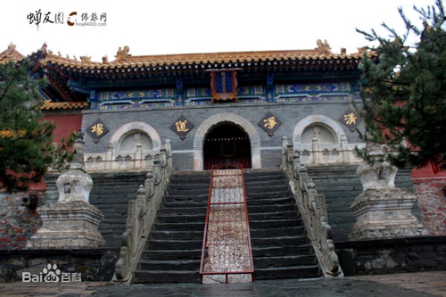 全寺占地四十五畝,順山就勢(shì)而筑殿宇,布局嚴(yán)謹(jǐn)。寺前有石階一百零八級(jí)。山門內(nèi)有天王殿、鐘鼓樓、大雄寶殿等建筑。各殿均用三彩琉璃瓦覆蓋。又,寺內(nèi)有康熙御碑,方座螭首,矗立在前院;乾隆御碑在東禪院碑亭內(nèi),以方形巨石雕成,高六公尺,每面寬一公尺,上刻漢、滿、蒙、藏四種文字。