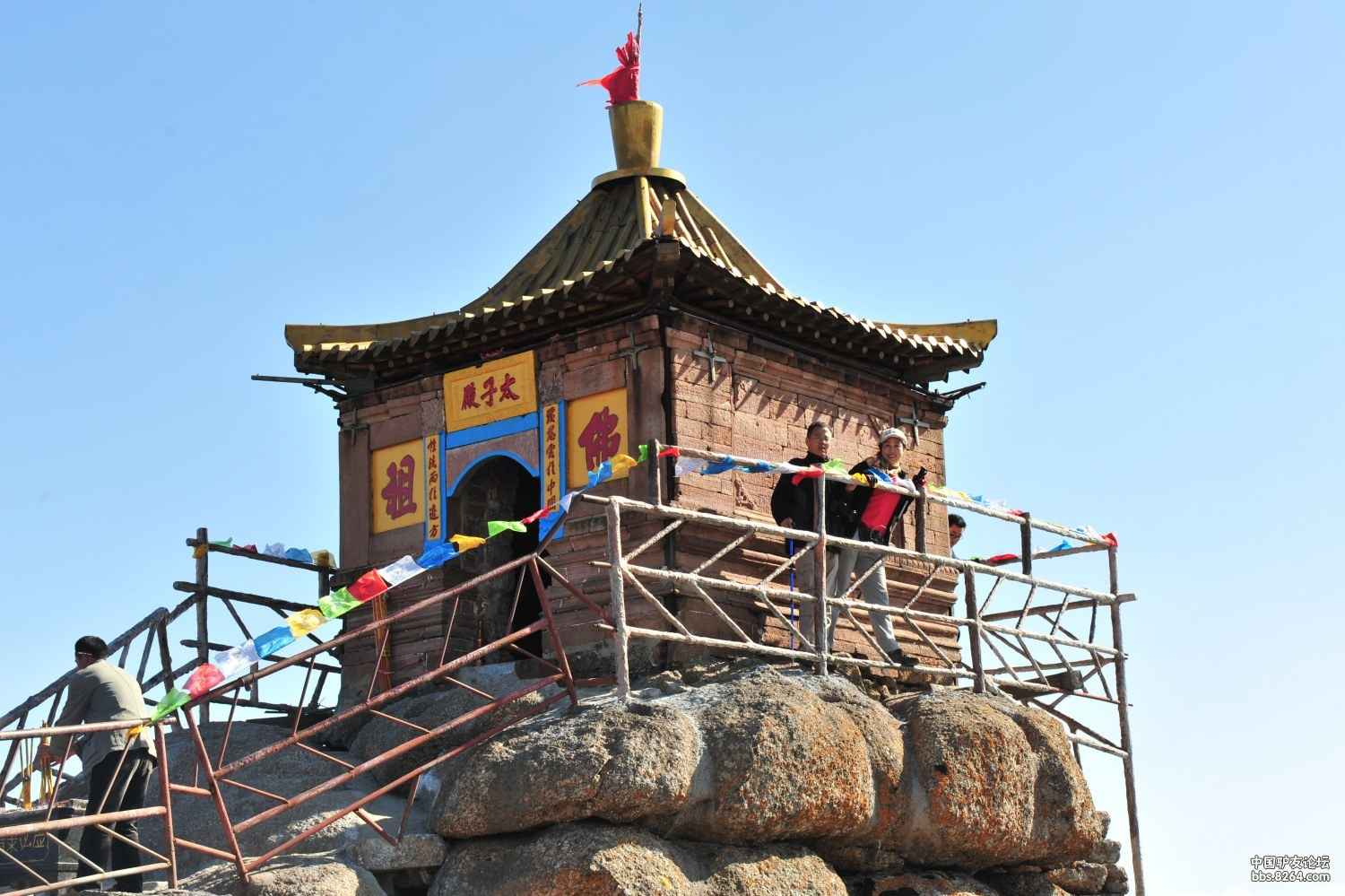 殿中所供“太子”,就是佛祖如來的法身毗盧佛。每遇干旱少雨,附近州縣的百姓便來這里求雨。為了顯示求雨者的誠心,一群男人頭戴柳梢帽,赤腳光膀,用長桿抬著當?shù)氐摹褒埻鯛敗保描尨蚬?,一路走來,到山腳下,便要三步一叩拜,一直拜到“離天最近”的太子殿祈雨。據(jù)說,這種做法非常有效,求雨人總能在回家的路上看到甘霖喜降。