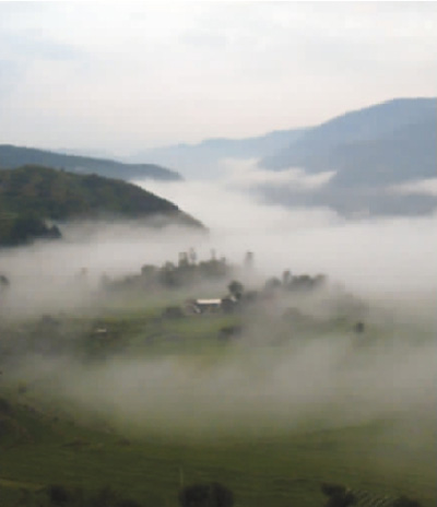 選了一個(gè)清晨,我們數(shù)個(gè)觀霧愛(ài)好者相約,在洱源西部中心的煉鐵街頭,搭乘從古鹽城喬后開(kāi)往熱水城洱源的中巴客車,沿著S形彈石公路,經(jīng)一個(gè)多小時(shí)的左拐右彎的顛簸,終于爬到了霜雪滿地、寒風(fēng)凜冽的羅坪山頂。這時(shí),太陽(yáng)正好從東邊的峰嶺間慢慢地露出笑臉來(lái),燦爛的微笑灑滿了羅坪山與黑惠江之間的縱橫溝塹及高低不平的煉鐵壩。我們下車,迅速爬上觀霧的最佳山頭。