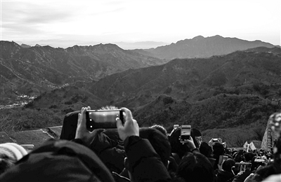 2018年一天,來自各地的數(shù)百游客在早晨6時許,紛紛登上慕田峪長城,迎接2018年的第一縷曙光,為新的一年祈福。