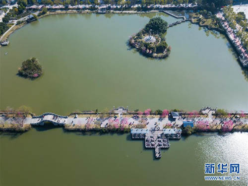 3月11日,游人在福建農(nóng)林大學(xué)校內(nèi)賞花(無(wú)人機(jī)拍攝)。