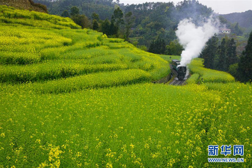 3月19日,一輛小火車(chē)從樂(lè)山市嘉陽(yáng)鎮(zhèn)的油菜花田中駛過(guò)。早春時(shí)節(jié),四川省樂(lè)山市嘉陽(yáng)鎮(zhèn)的油菜花競(jìng)相綻放,一派春意盎然的景象。 新華社發(fā)(張偉 攝)