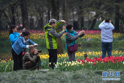 3月19日,市民和游客在太子灣公園觀賞盛開的郁金香。近日,浙江省杭州市西子湖畔太子灣公園里的郁金香、櫻花競(jìng)相綻放,吸引大批游客和市民前來觀賞。 新華社記者 黃宗治 攝