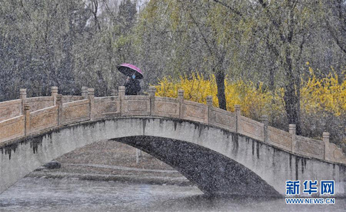4月3日,市民在延慶區(qū)一個公園中賞雪。當日,華北中部地區(qū)氣溫驟降,位于燕山山脈腳下的北京市延慶區(qū)降下一場春雪。 新華社記者 李欣 攝