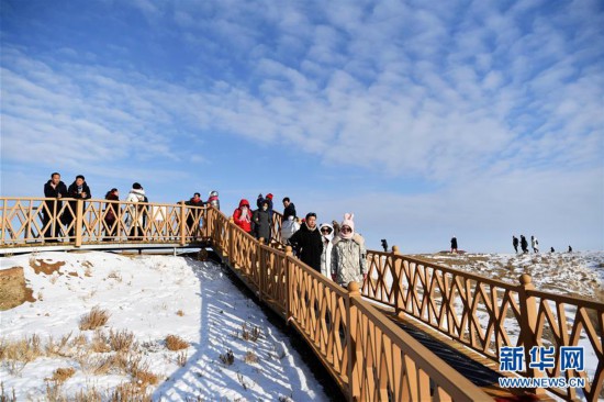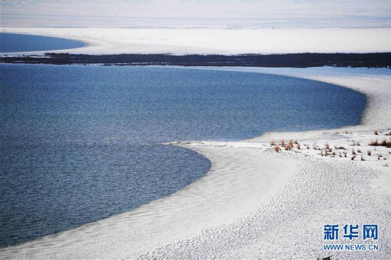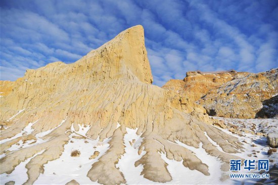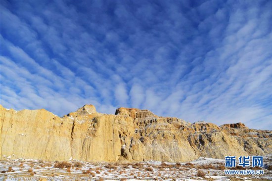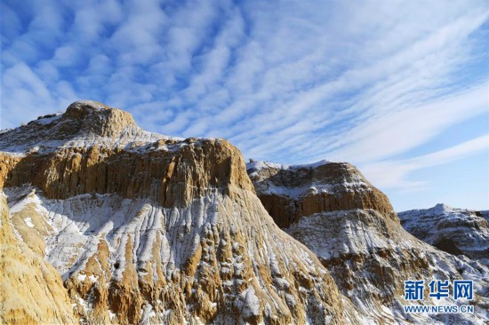 11月26日拍攝的新疆福海縣烏倫古湖海上魔鬼城景區(qū)美景。 福??h烏倫古湖海上魔鬼城景區(qū)位于新疆阿勒泰地區(qū)福??h吉力湖東岸,有著獨(dú)特的雅丹地貌和水域景觀,是當(dāng)?shù)刂穆糜蝿俚亍?新華社記者 沙達(dá)提 攝