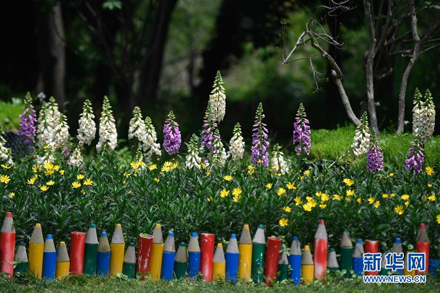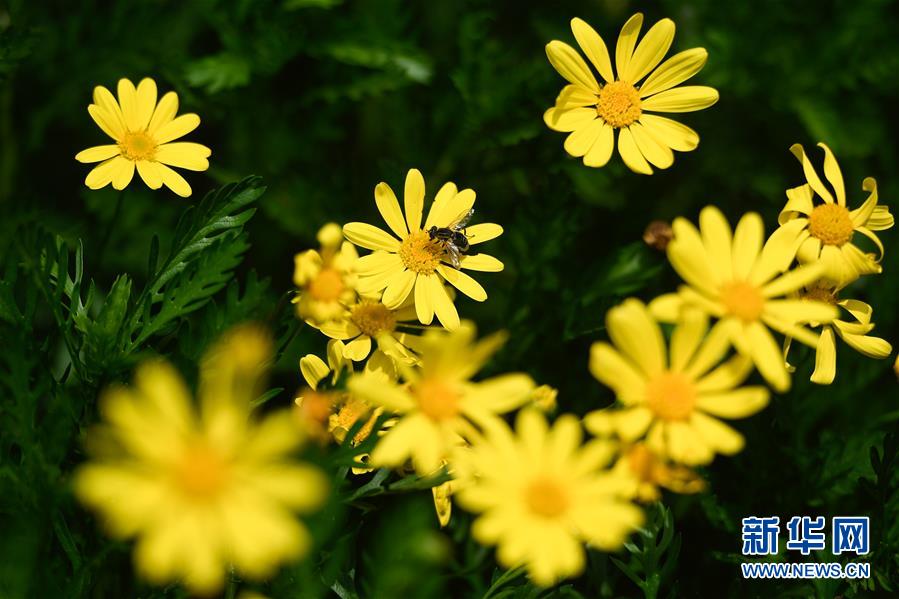 4月26日,蜜蜂在西溪濕地一片盛開的黃金菊上采蜜。 近日,第十屆“西溪花朝節(jié)”在杭州西溪國家濕地公園舉辦,沿著綠堤布置的百萬盆花卉次第綻放,呈現(xiàn)出一片片“浪漫花?!钡木跋?。 新華社記者 黃宗治 攝