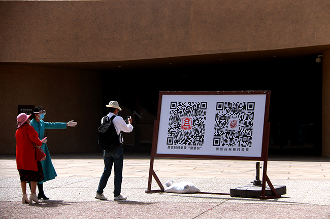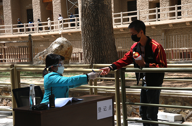 10日上午9點(diǎn),在敦煌莫高窟數(shù)字展示中心門(mén)票業(yè)務(wù)辦理處,幾十名游客正在“1.5米線”排隊(duì)等候測(cè)溫登記,在通向窟區(qū)的擺渡車(chē)上,游客按照間隔就座。游客申領(lǐng)國(guó)家或者甘肅省的“健康碼”后,可預(yù)約購(gòu)買(mǎi)10日內(nèi)的門(mén)票。