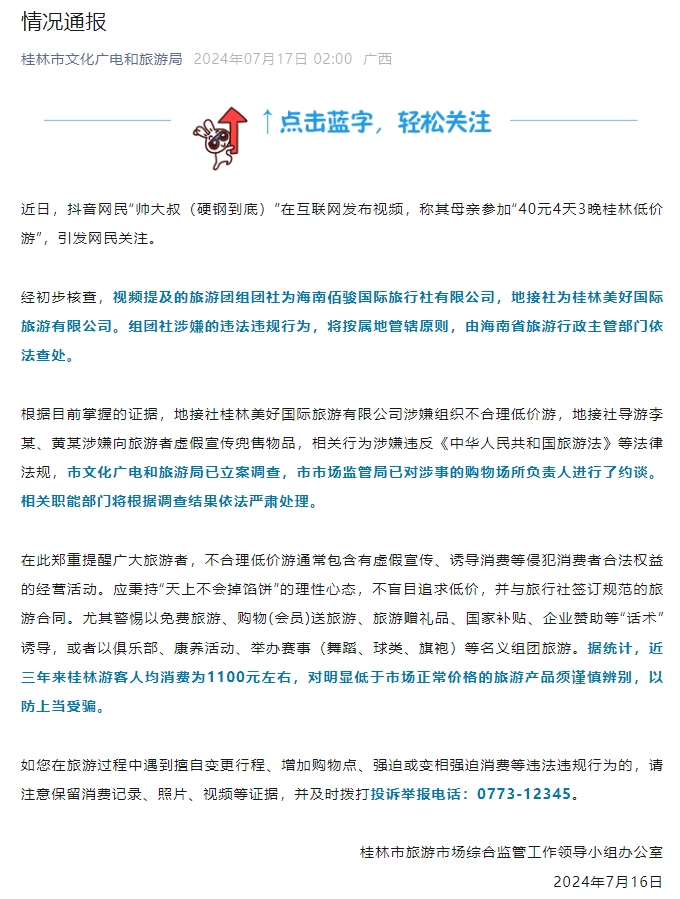 中新網(wǎng)7月17日電 桂林市文化廣電和旅游局官微發(fā)布情況通報(bào),近日,抖音網(wǎng)民“帥大叔(硬鋼到底)”在互聯(lián)網(wǎng)發(fā)布視頻,稱其母親參加“40元4天3晚桂林低價(jià)游”,引發(fā)網(wǎng)民關(guān)注。
