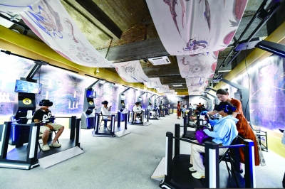 7月22日,游客線下體驗“尋境敦煌——數(shù)字敦煌沉浸展”。 “尋境敦煌”綜合運用虛擬現(xiàn)實、三維建模、游戲引擎的物理渲染和全局動態(tài)光照等新技術(shù),高精度立體還原了莫高窟第285窟。游客戴上VR眼鏡,不僅可以零距離觀賞壁畫、360度自由探索洞窟細節(jié),還能“飛升”到窟頂,身臨其境參與壁畫故事情節(jié),沉浸式感受敦煌文化的魅力。 新華社記者 郎兵兵/攝
