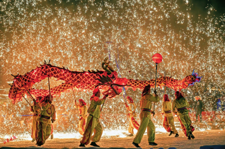 除了誘人的美食,精彩演藝必不可少?!靶麓貉灿巍钡慕k麗花車流光溢彩,演員們身著精致華麗的服飾載歌載舞,與游客熱情互動。限定非遺“祈福花火秀”更是帶來一場視覺盛宴,“鐵樹銀花落,萬點(diǎn)星辰開”,火龍鋼花與落花秀相互交融,鐵火流星漫天飛舞,一起感受跨越千年的祝福與熾熱。還有“鬧新春”主題晚會,歌舞、雜技輪番上演。廣大游客還可在歡聲笑語中圍著篝火牽手狂歡,共度闔家團(tuán)圓的美好時光。