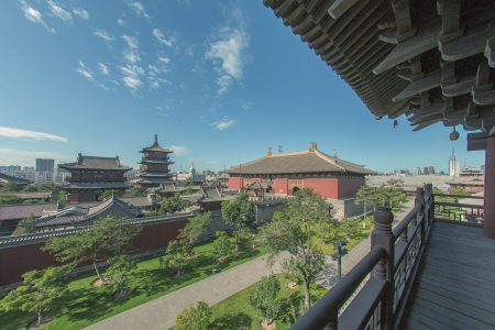 華嚴(yán)寺始建于遼重熙七年(公元1038年),其名取自佛教經(jīng)典《華嚴(yán)經(jīng)》中“慈悲之華,必結(jié)莊嚴(yán)之果”。寺院坐西向東,山門、普光明殿、大雄寶殿、薄伽教藏殿、華嚴(yán)寶塔等30余座單體建筑分別排列在南北兩條主軸線上,布局嚴(yán)謹(jǐn),規(guī)模宏大,占地面積達(dá)6.6萬(wàn)平方米,是我國(guó)現(xiàn)存年代較早、保存較完整的一座遼金寺廟建筑群,1961年被國(guó)務(wù)院公布為第一批全國(guó)重點(diǎn)文物保護(hù)單位,2014年被評(píng)為國(guó)家4A級(jí)旅游景區(qū)。