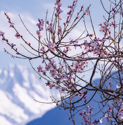 盛開(kāi)的桃花與遠(yuǎn)處的雪山相映成景。