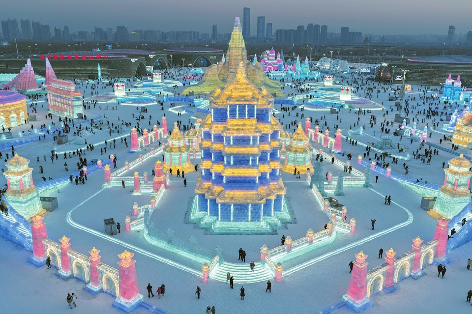 12月17日,游客在哈爾濱冰雪大世界園區(qū)游玩。當日上午10時,第二十七屆哈爾濱冰雪大世界正式開園迎客。園區(qū)占地面積達120萬平方米,總用冰用雪量突破40萬立方米,以歷屆之最的規(guī)模,打造一座冰天雪地的“童話世界”。